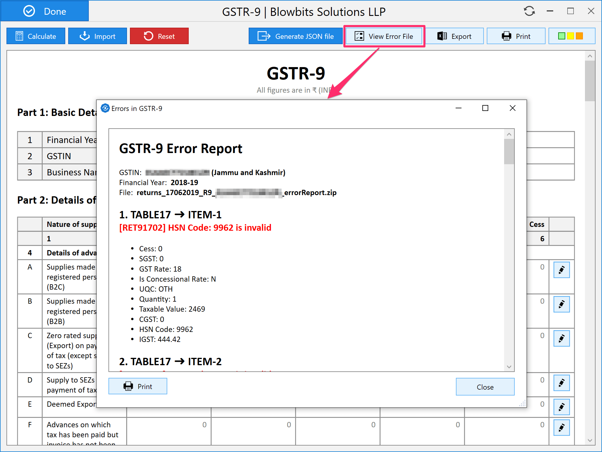 - Added the facility to view the GSTR-9 error file generated by GST Portal.