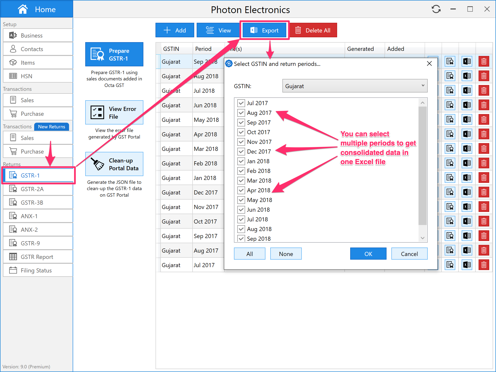 On the GSTR-1 page, Click on the Export button and select the periods you would like to export. If you select multiple periods, all the data from selected periods will be exported to a single Excel file.